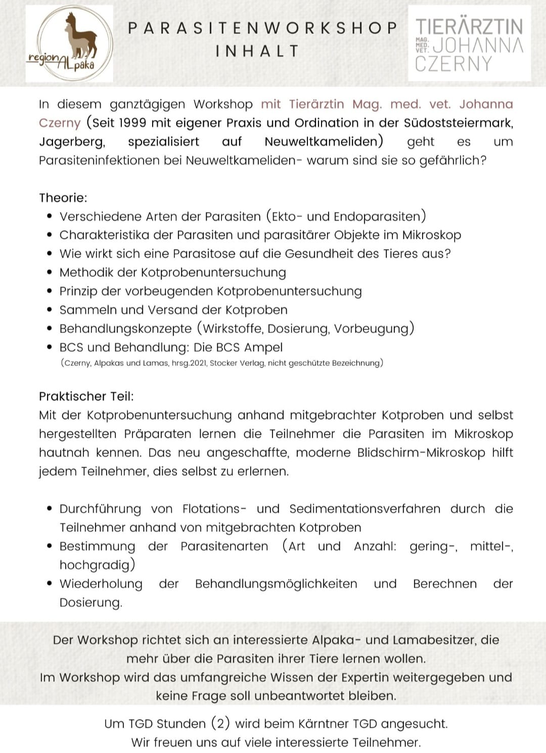 Herzliche Einladung zum Workshop mit Tierärztin Mag. med. vet. Johanna Czerny und interessanten Themen: